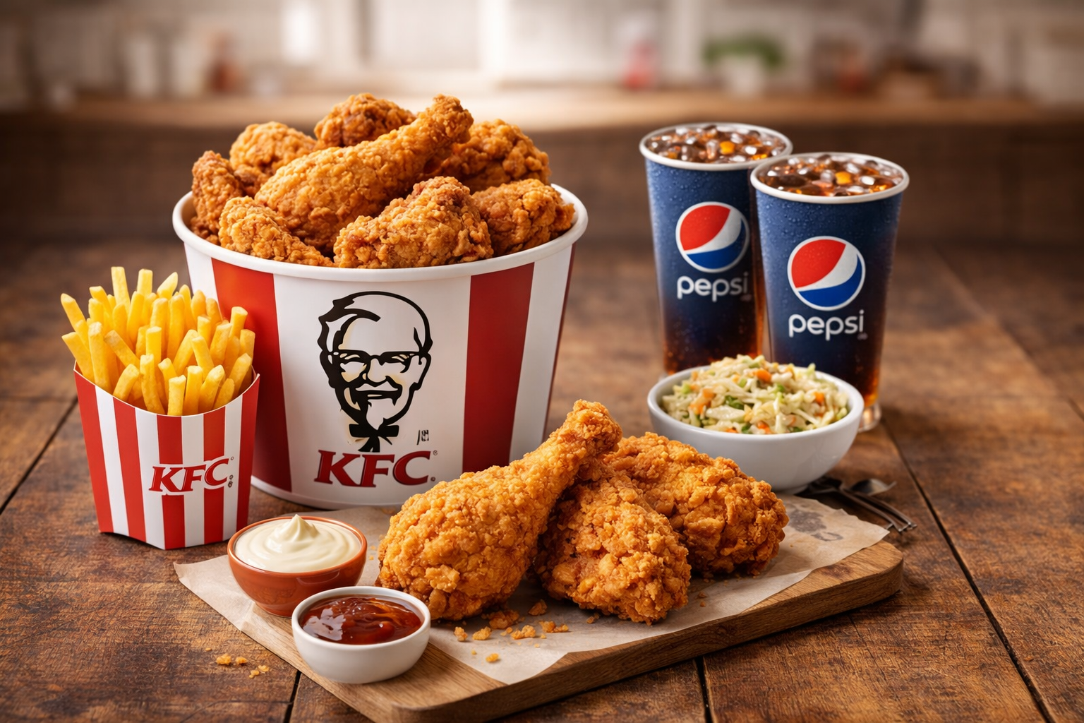 Classic Family Bucket includes crispy drumsticks, golden fries, creamy coleslaw, refreshing drinks, and signature dipping sauces served together.