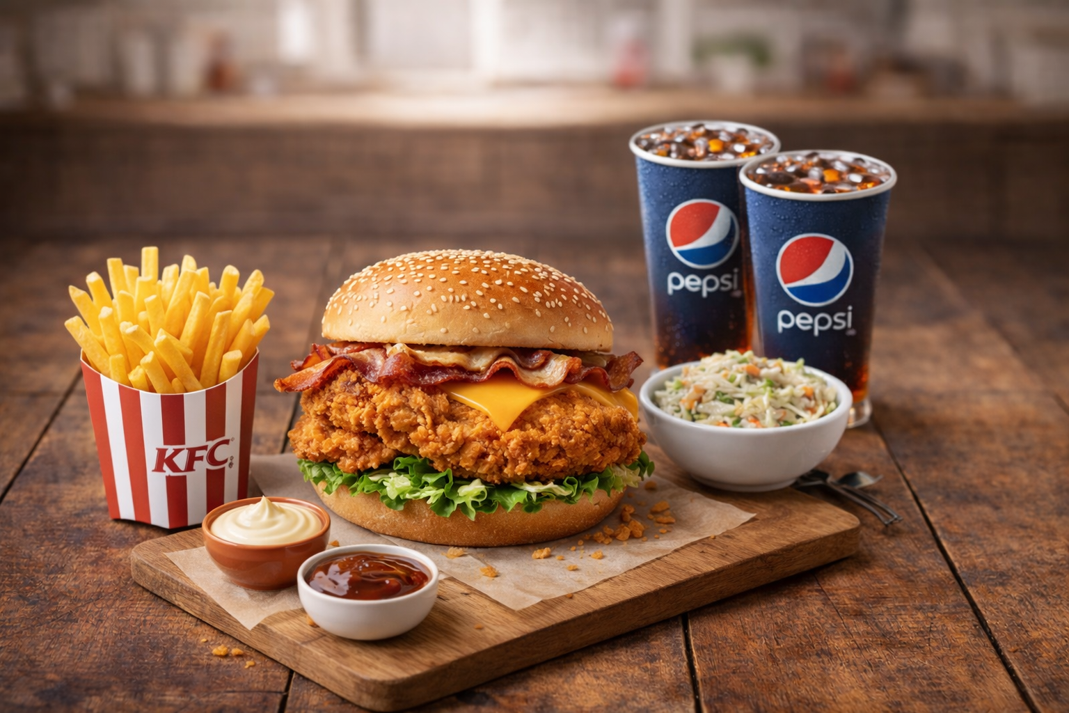 A meal component has a crispy chicken burger, a fries side, and inside the tray there are dipping sauces and chilled drinks parts.