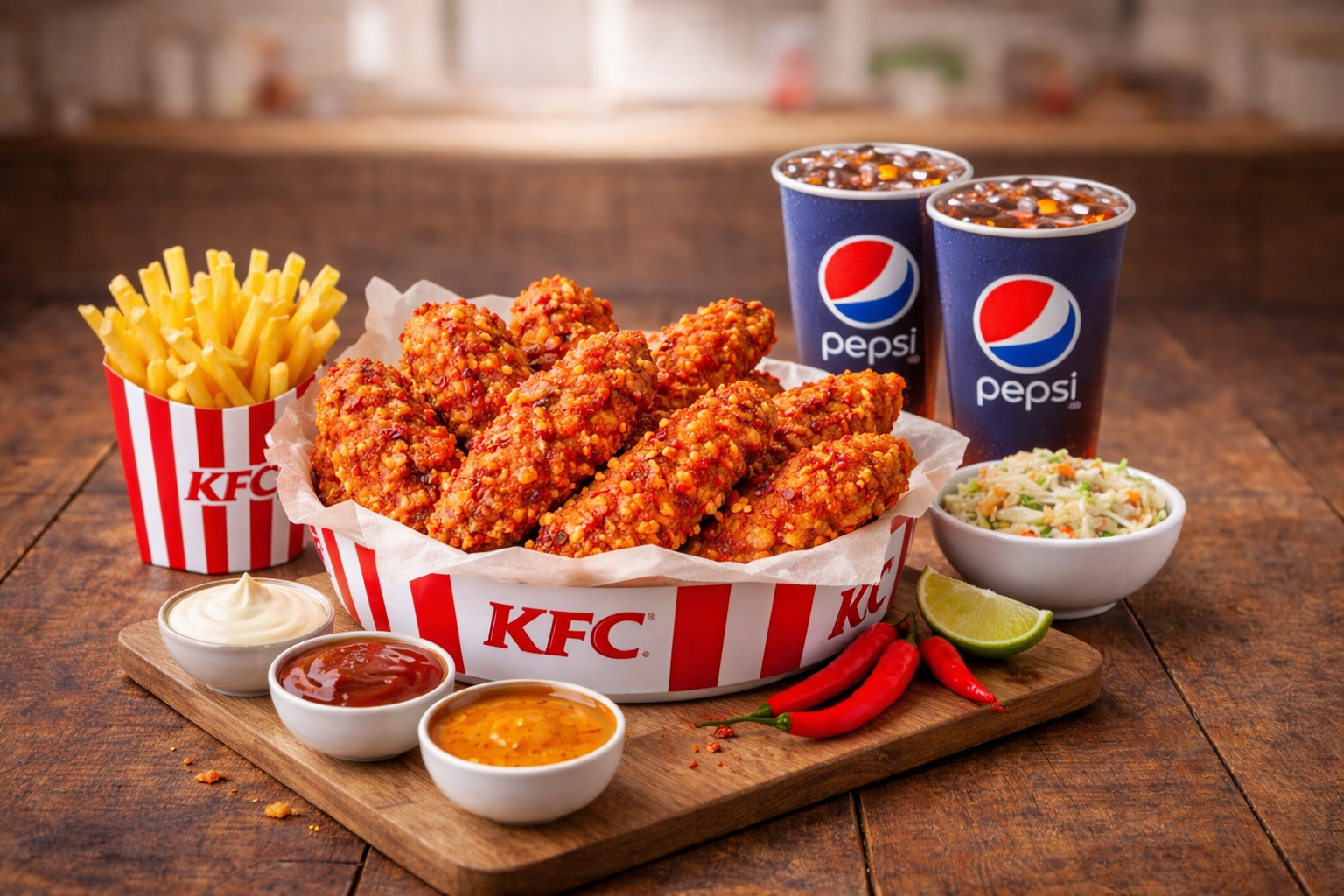A bucket component has spicy chicken tenders, a fries portion, and inside the setup there are sauces and cold beverage parts.