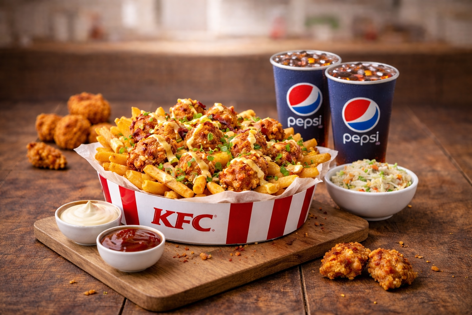 A bowl component has seasoned fries topped with chicken bites, a sauce layer, and inside the combo there are sides and drink parts.