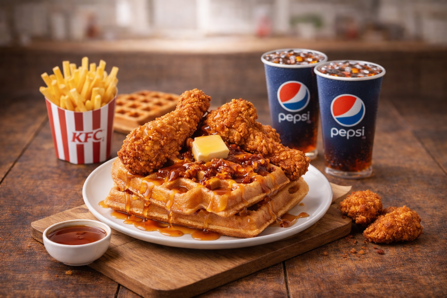 A plate component has waffles with crispy chicken strips, a syrup topping, and inside the meal there are fries and soft drink parts.